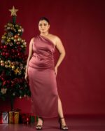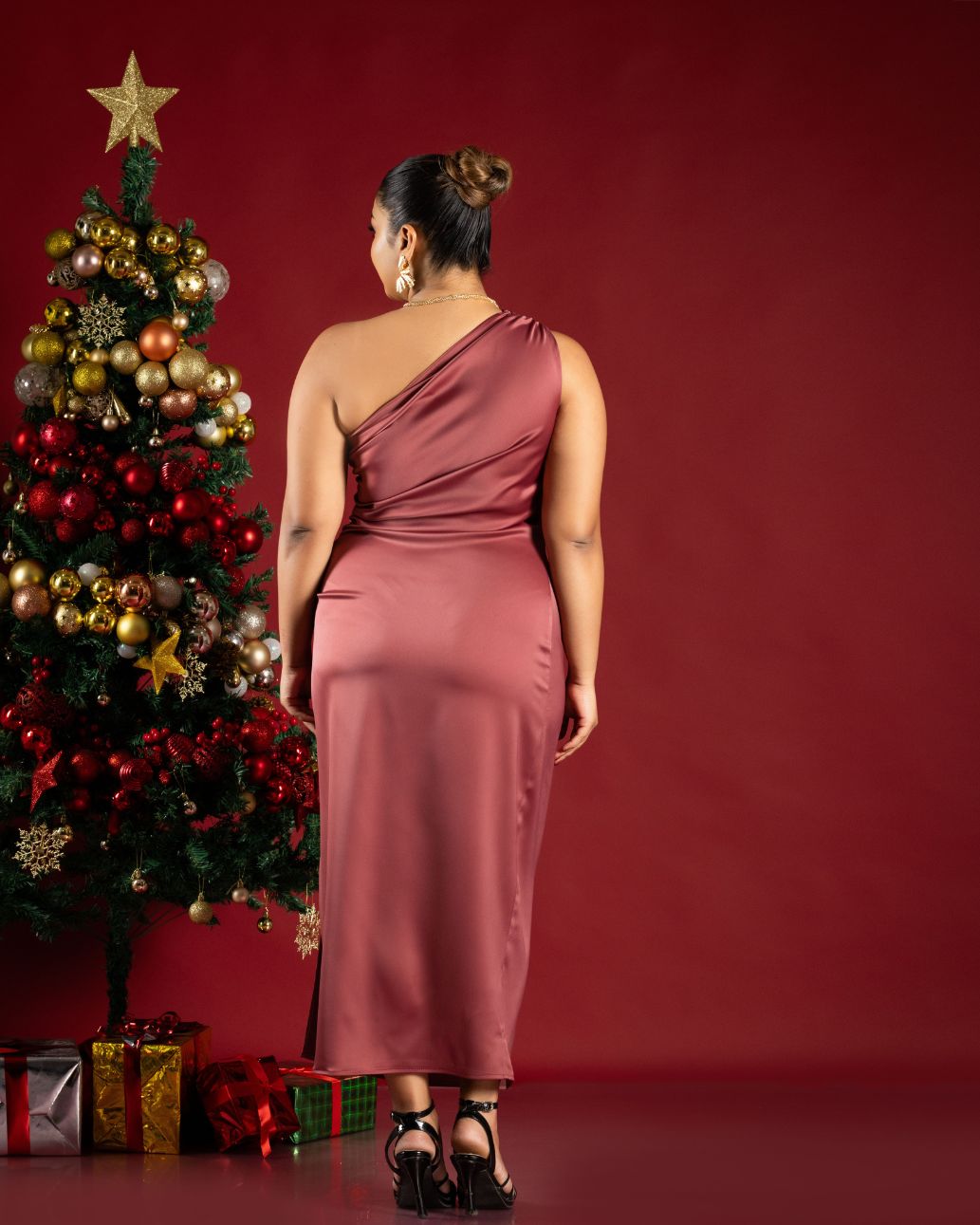 The dress is a vibrant dusty rose and features an elegant asymmetrical neckline