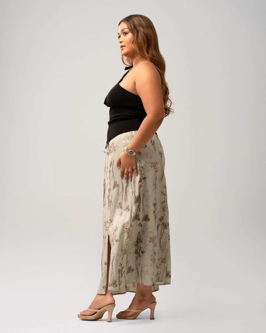 100% cotton green printed skirt with a slit in front and elasticated back waist