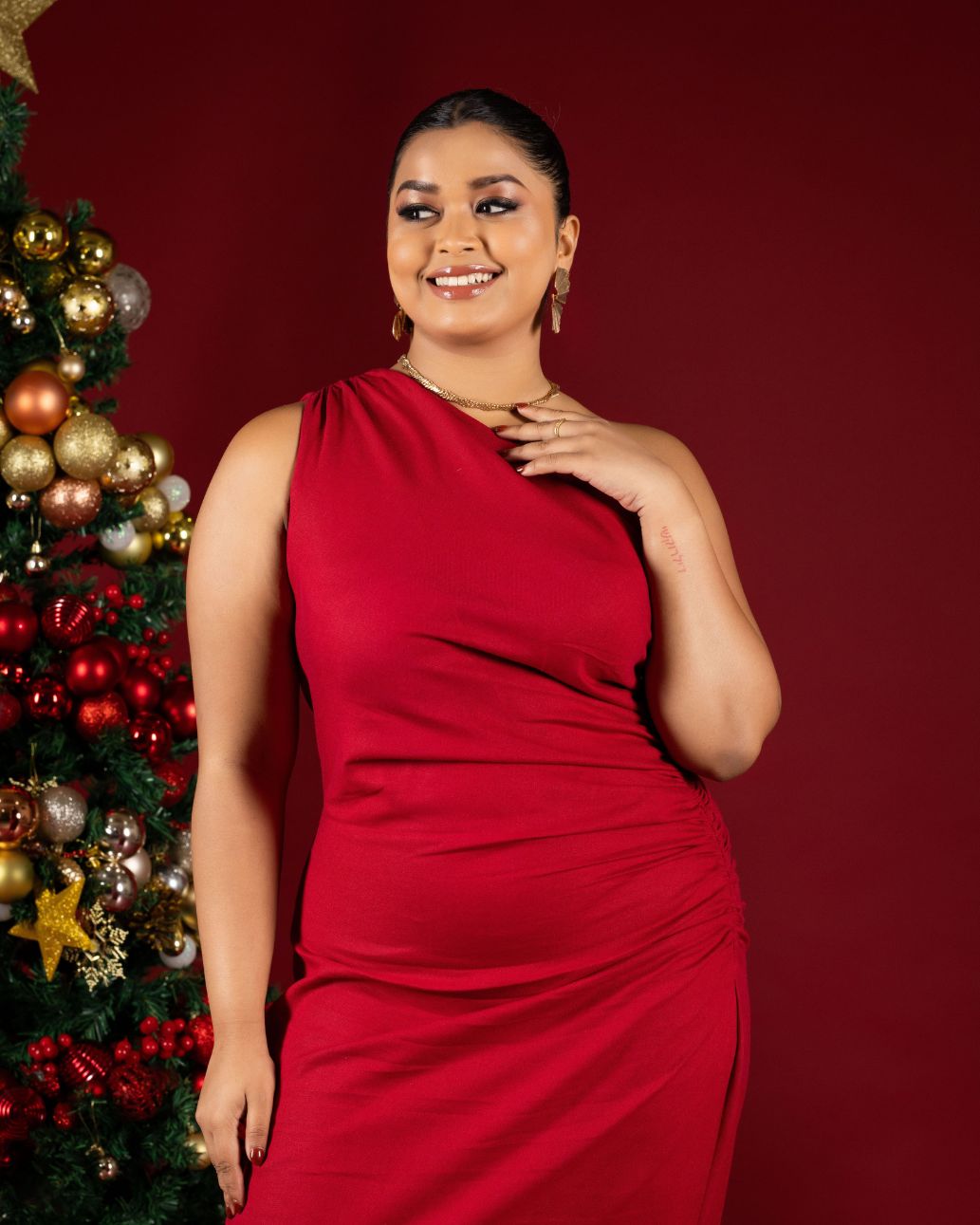The dress is a vibrant red and features an elegant asymmetrical neckline